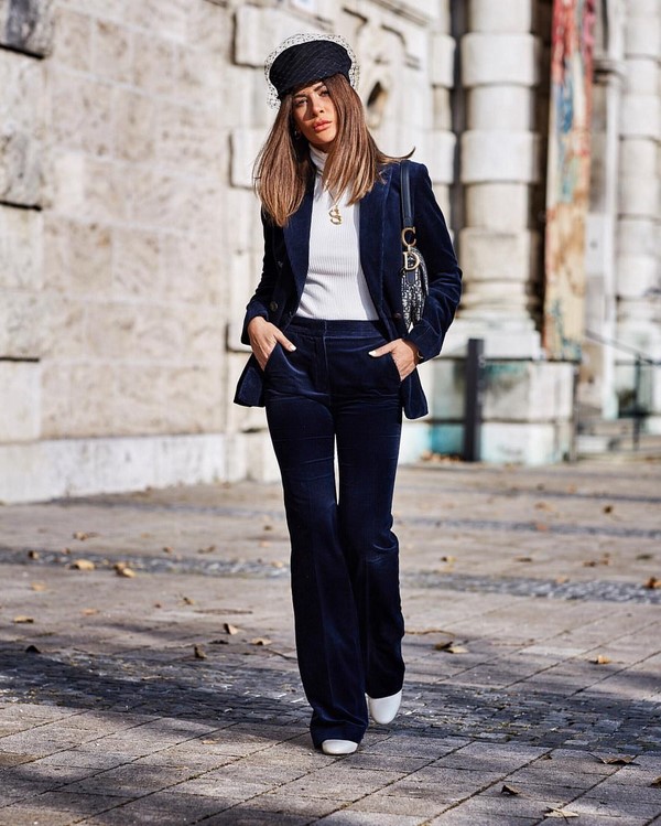 Gaya ideal dan mulia baju seluar 2025-2026 untuk musim luruh dan musim sejuk akan menjadi model velor atau beludru. Warna gelap dalam biru dan burgundy, wain dan zamrud kelihatan hebat dalam tekstur ini, memberikan corak khas kepada imej-imej dengan pantsuit.