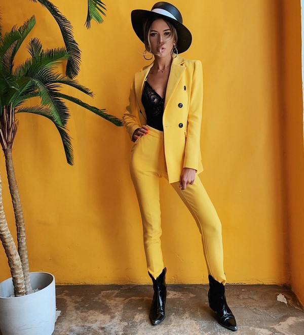 Di antara barang kemas seluar panjang, gaya monokrom menonjol dalam warna kuning cerah, zaitun, raspberi, biru lembut, pasir, warna asfalt basah, karamel dan warna serbuk.